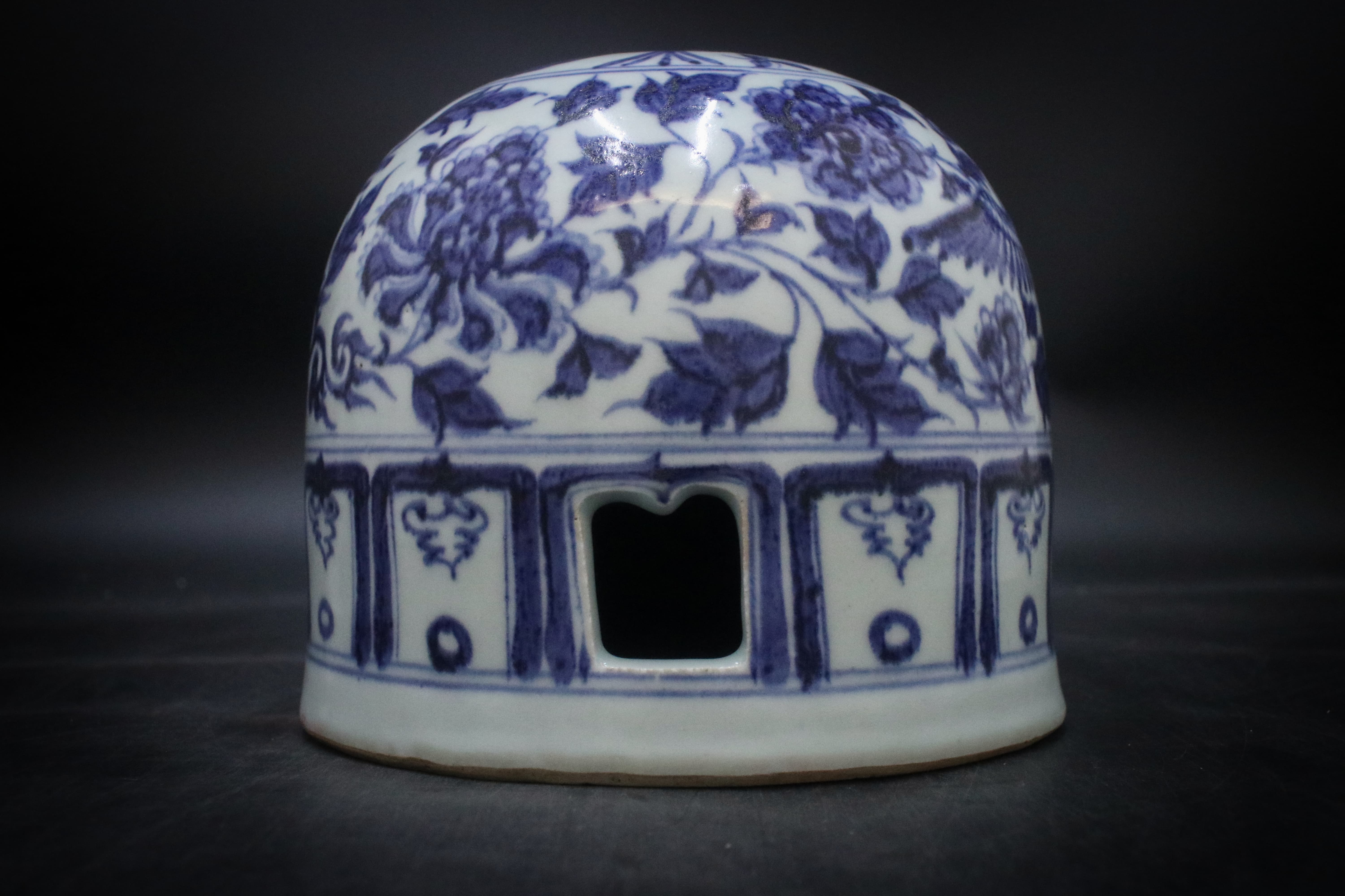 元青花,作為中國陶瓷史上濃墨重彩的一筆,開創(chuàng)了由素瓷向彩瓷過渡的新時(shí)代。這件元青花鳳穿牡丹花紋蒙古包造型獨(dú)特,整體呈穹頂狀,類似傳統(tǒng)蒙古包的外形輪廓。底部較為平整,可平穩(wěn)放置。中部有一個(gè)不規(guī)則形狀的開口,可能是用于放置或取出內(nèi)部物品,兼具實(shí)用性與裝飾性。這種造型在瓷器中較為少見,將蒙古族特色建筑元素與瓷器工藝相結(jié)合,別具一格。