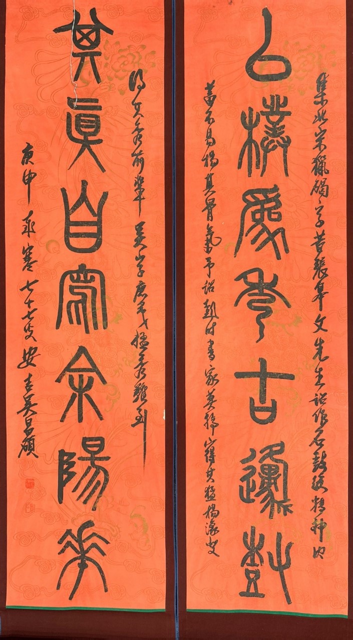 吳昌碩對篆書的鉆研極為深厚,此對聯(lián)便是其篆書藝術的杰出代表。觀其字跡,線條蒼勁雄渾,如千年古藤,堅韌而富有張力 。運筆之間,既有古樸的金石之氣,又不失靈動之姿,每一筆都仿佛蘊含著無盡的力量。篆書字體結構嚴謹而又不乏變化,錯落有致,展現(xiàn)出吳昌碩對篆書藝術高超的駕馭能力,盡顯古樸典雅之美,讓人仿佛穿越時空,感受到古老文字的獨特魅力。
