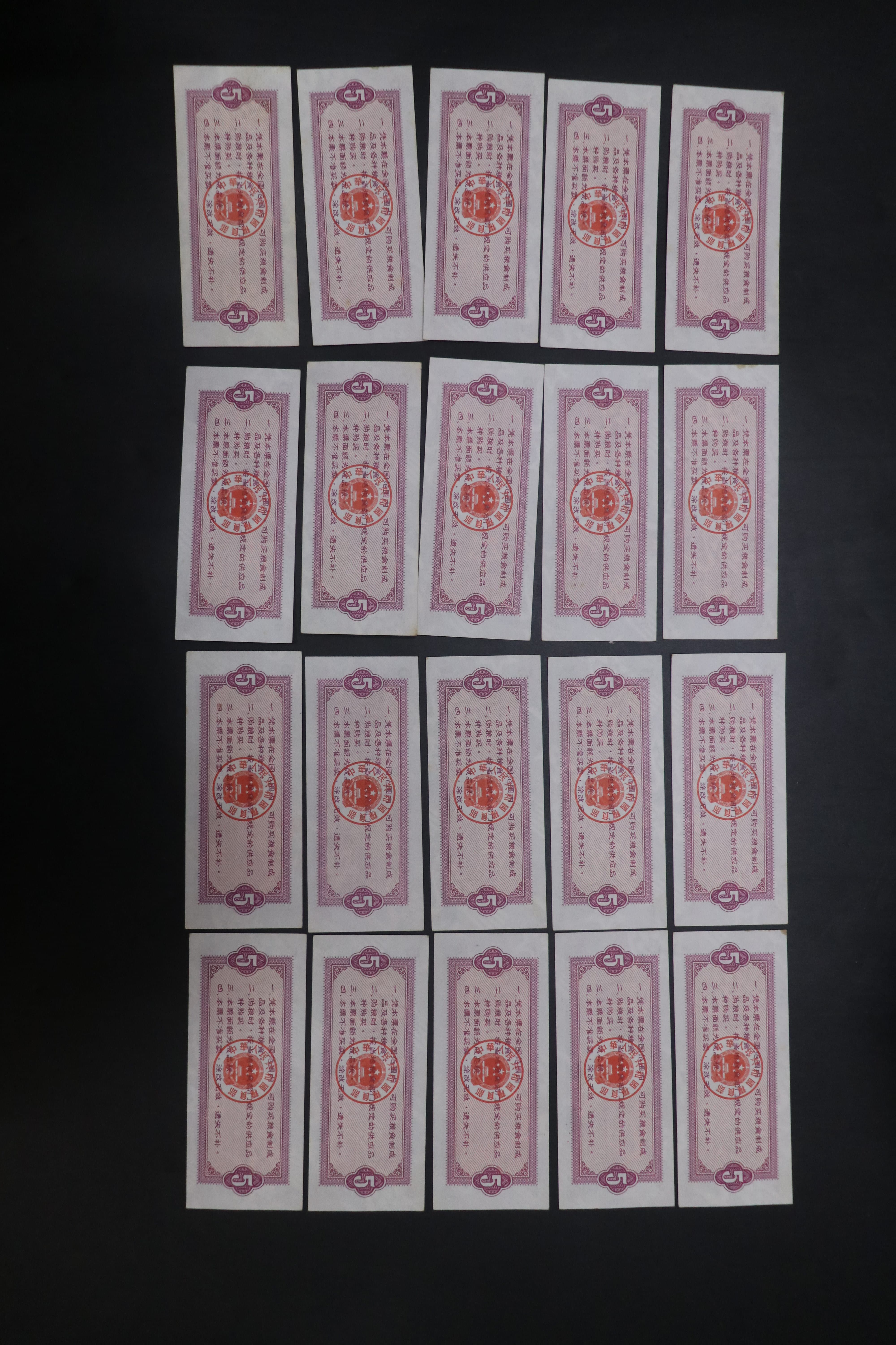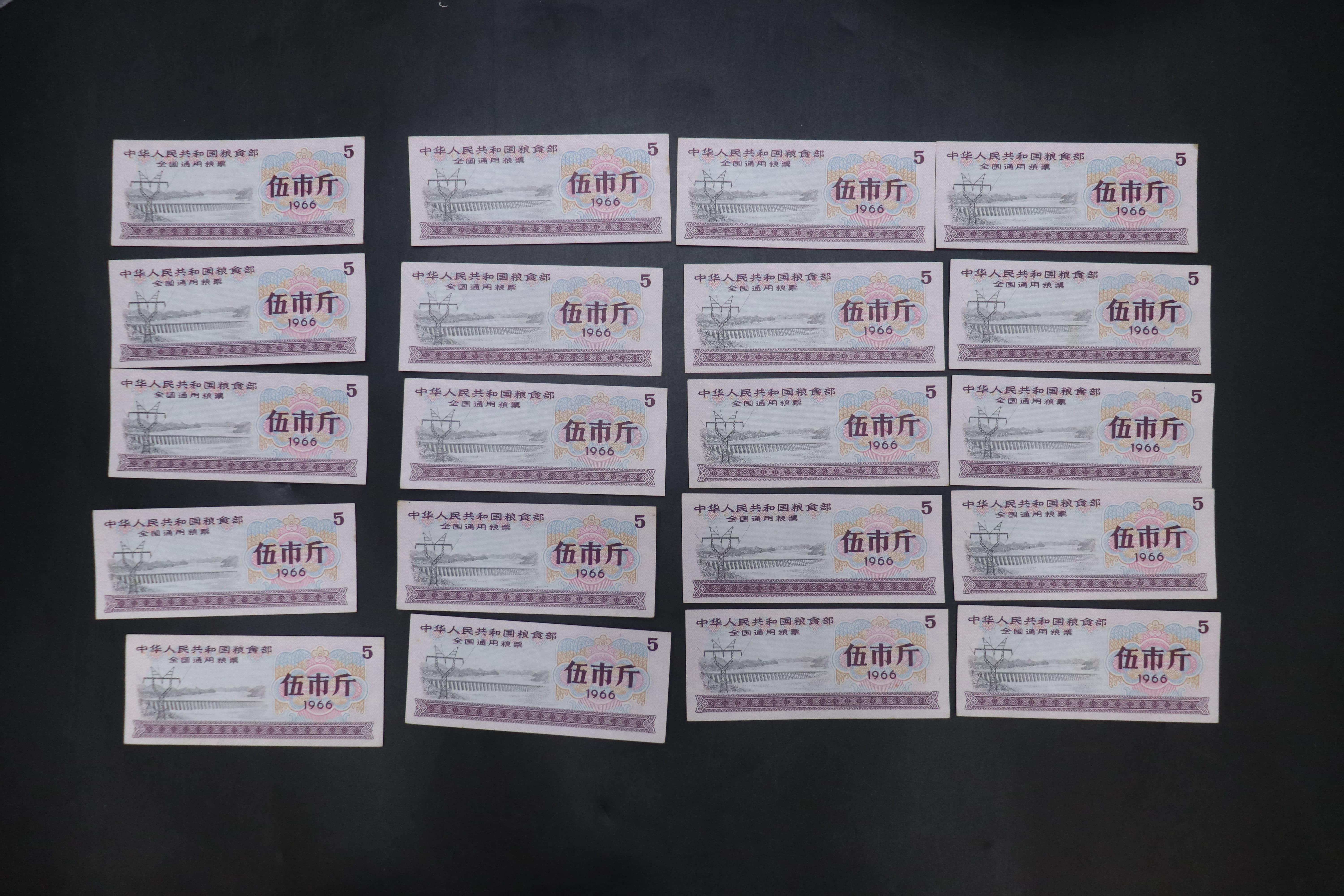 1966年,正值我國計劃經(jīng)濟體制深化階段,糧食供應(yīng)作為國家戰(zhàn)略資源,實行嚴格的票證管理制度。這版由中華人民共和國糧食部發(fā)行的全國通用糧票,以“全國通用”的屬性打破了地域限制,成為計劃經(jīng)濟時代名副其實的“糧食通貨”。本組20張伍市斤糧票的完整留存,不僅是稀缺的收藏品,更是研究計劃經(jīng)濟時期物資分配制度的“活化石”,每張票證都鐫刻著一個時代的集體記憶。